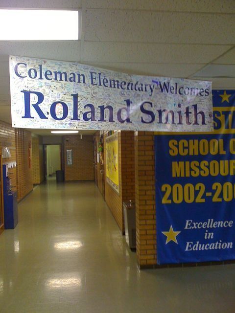I’m at Coleman Elementary in St. Joe, MO today with my sister, 4th grade teacher Brenda Smith and librarian extraordinaire Suzanne Thomas. They could not have been better prepared. I had a fabulous time. Thank you for the signed banner!