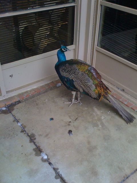 Greenhill has pea fowl wandering the campus. The one below is unhappy because of the pouring rain.