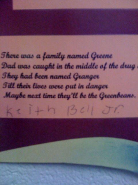 Your visit today affected two of my students in ways that they will always remember. John, the redhead who you met several times during the day, is (if there is) the perfect student, whose reading interest is strictly an intrinsic one fostered by, but not initiated by, the school system. He might, however, never have been intrigued by your books if you had not come for a visit. He was speechless (OK, not really speechless) with excitement. Keith, the Greenbean poet, is just the opposite as far as ability goes. He is an avid reader, but cannot at this point read your books independently. Your words to him in passing in the hallway and the posting of his work on your site may very well give him the push he needs to go further.