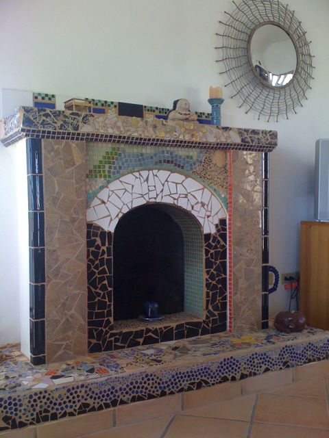 Below is the view from the back patio where I’m writing and the tiled fireplace in the house that I really like.